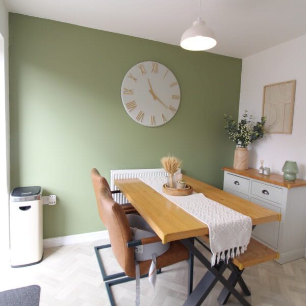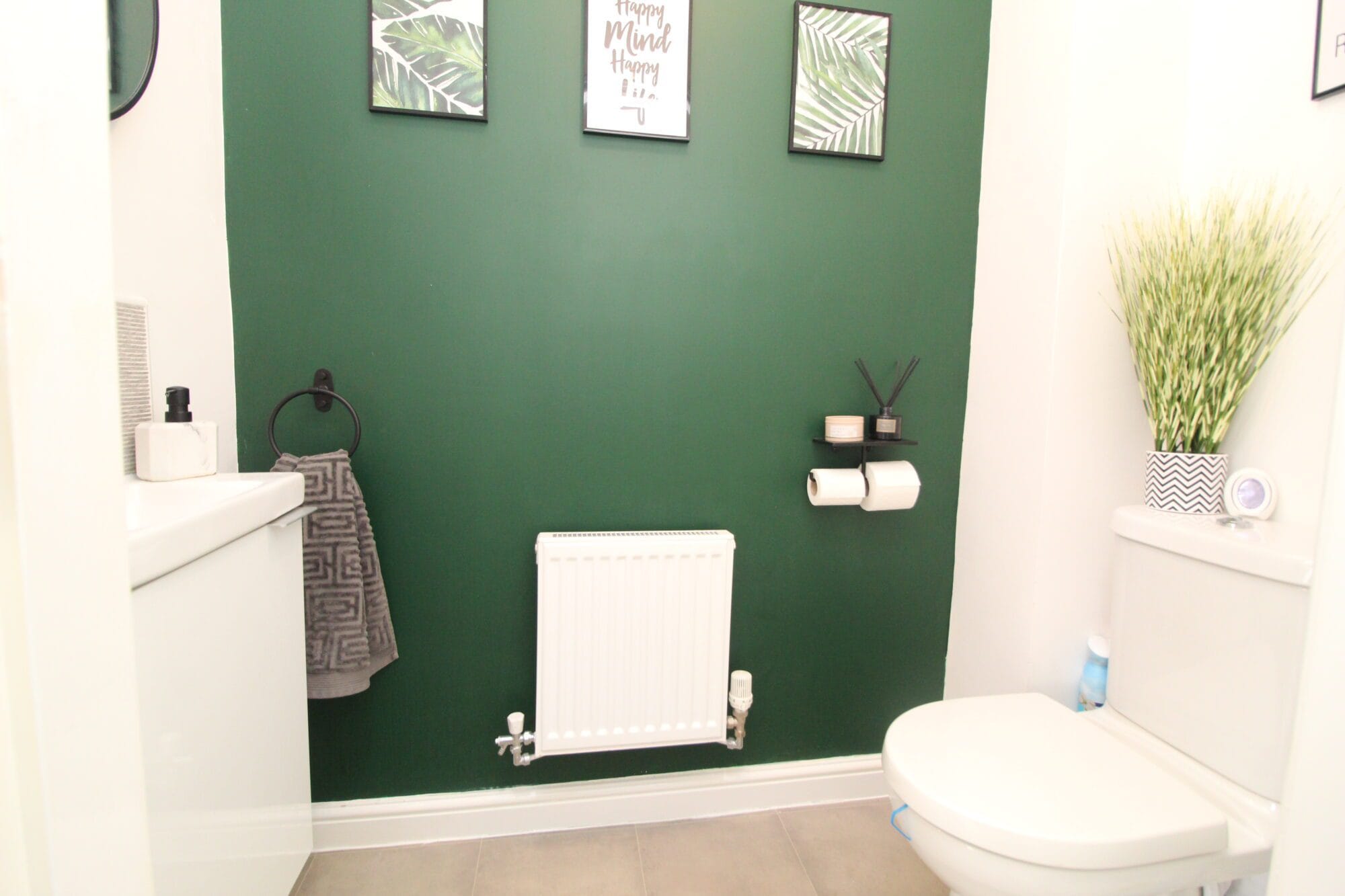 A bold and elegant cloakroom with striking dark green feature wall, modern white suite, and decorative accents. A convenient and stylish addition to the ground floor.