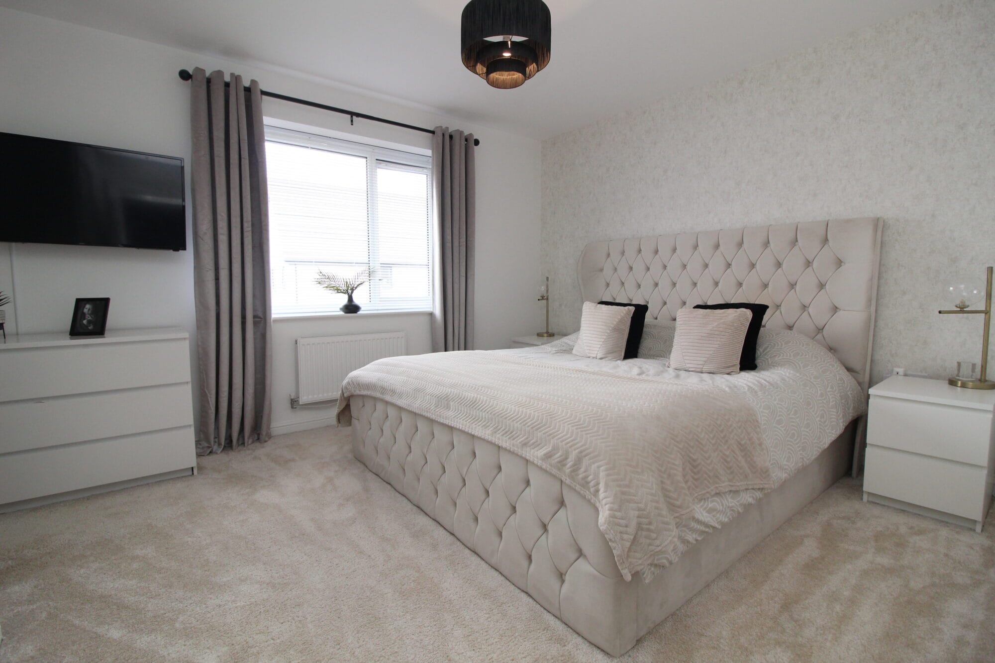 A luxurious and spacious principal bedroom with a stunning upholstered bed, large window, and soft neutral décor throughout. Space for wardrobes and drawers with room to spare.