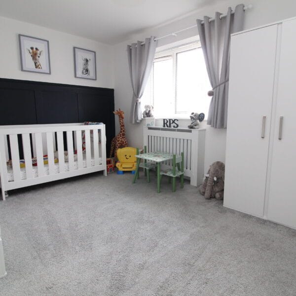 A generous second bedroom currently used as a nursery/playroom with soft carpeting and ample space for bedroom furniture or office conversion. Bright and inviting with a charming layout.