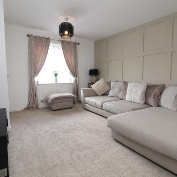 A generous lounge featuring plush carpet, panelled feature wall, and a large window that fills the room with light. The space is ideal for relaxing evenings or entertaining guests.