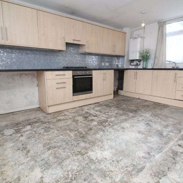Large kitchen diner currently arranged with base and wall units with contrasting work surfaces, splash back tiling, integrated oven & space for dining table.
