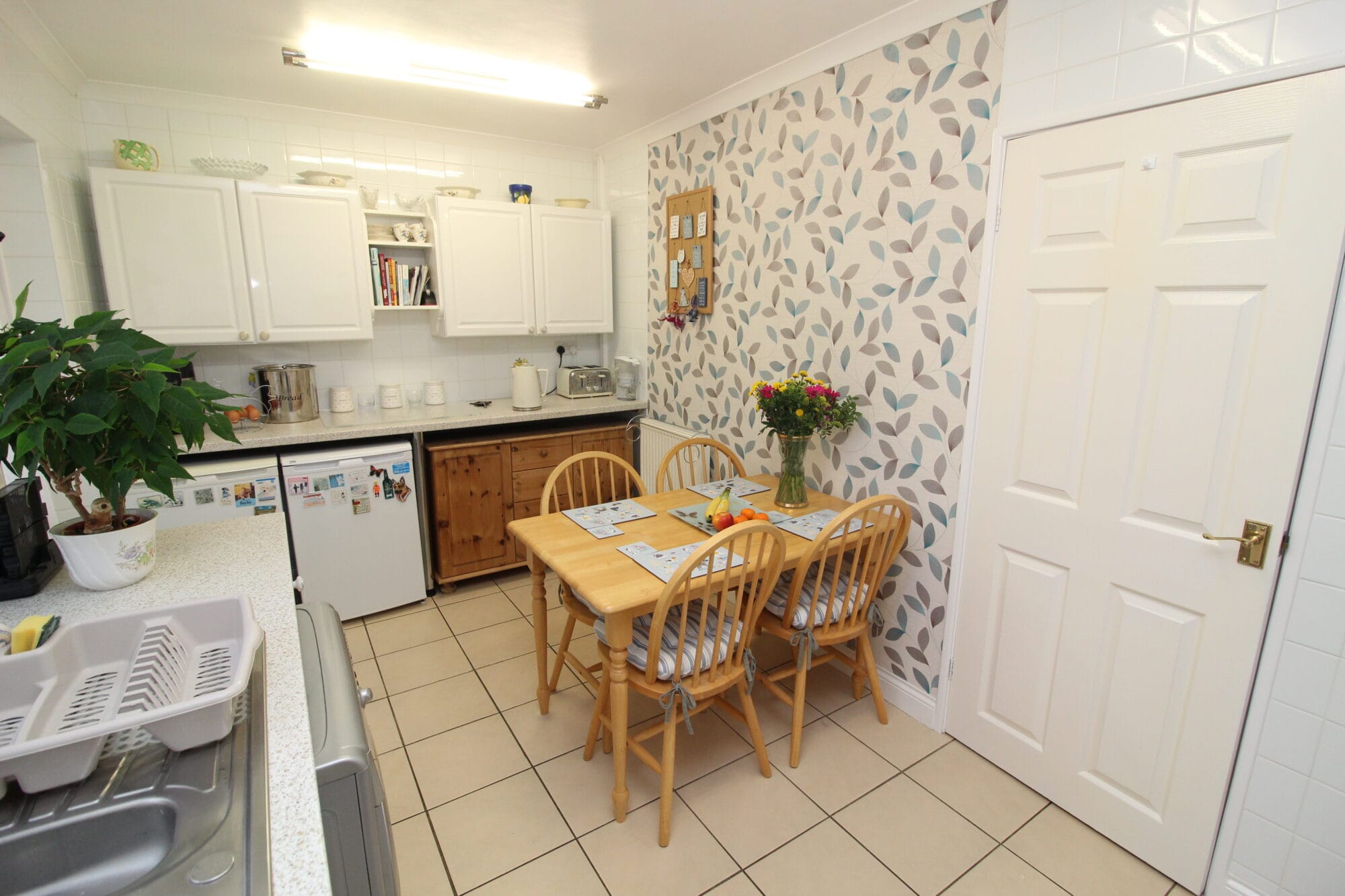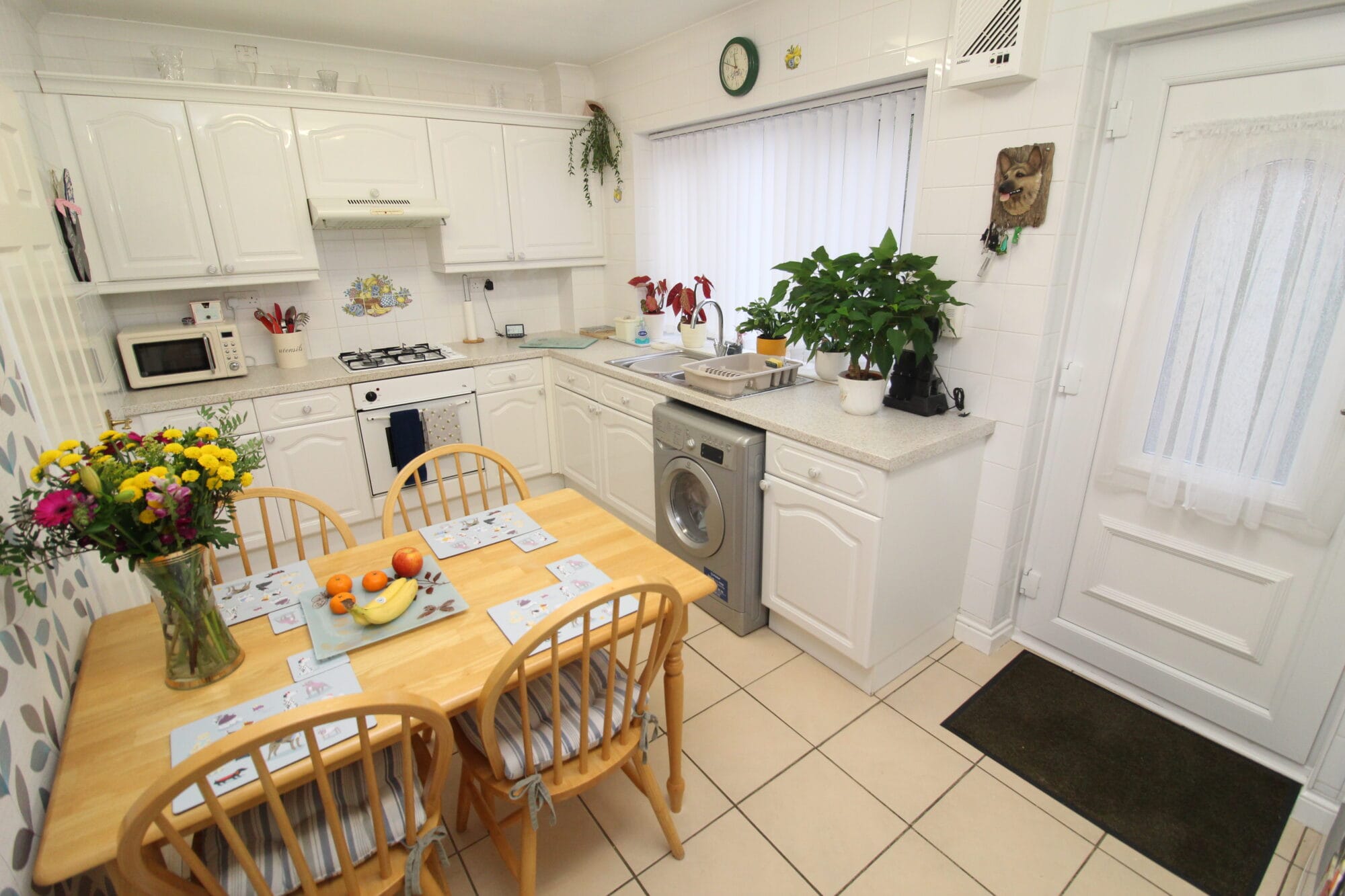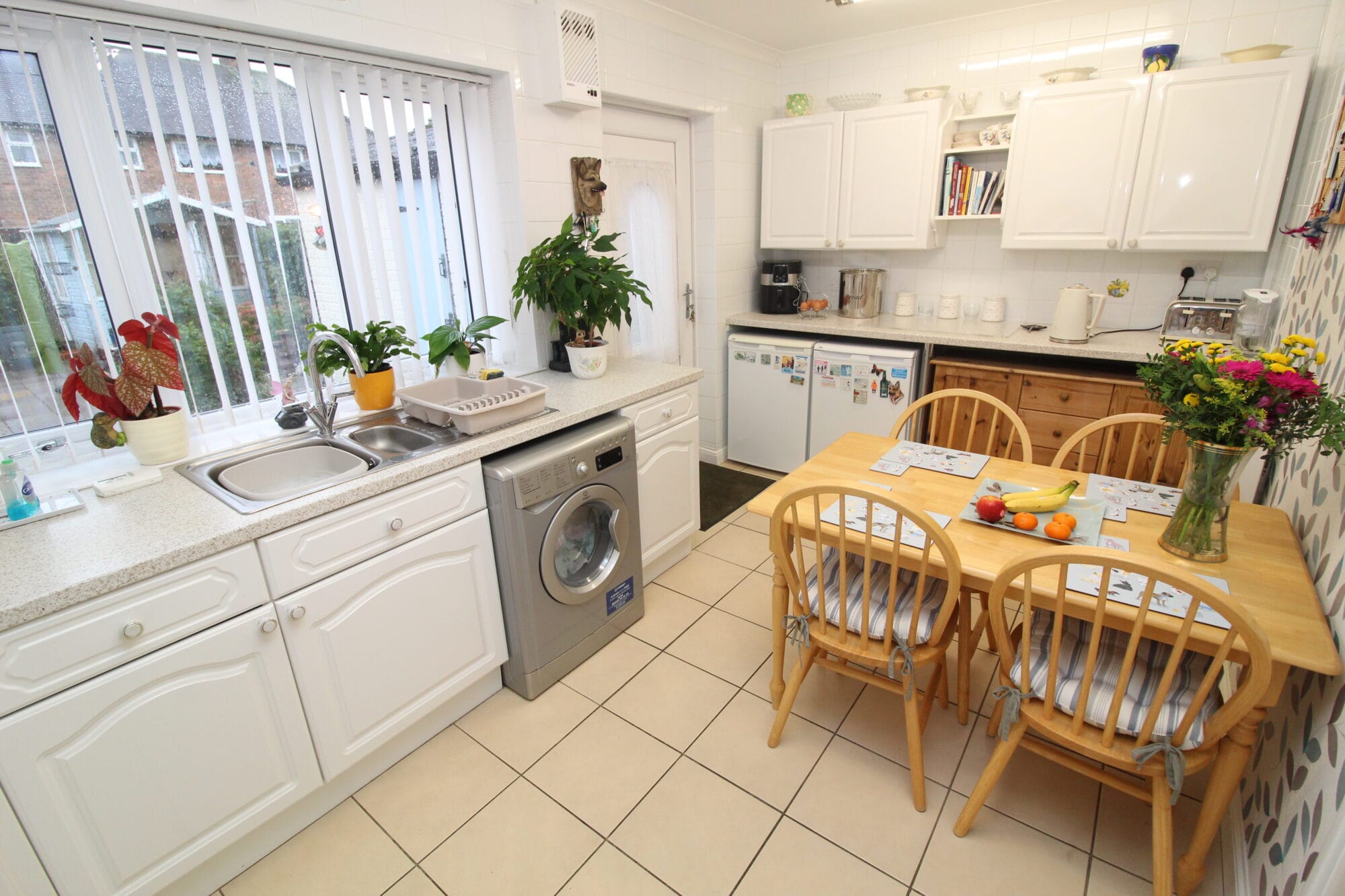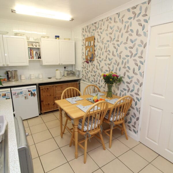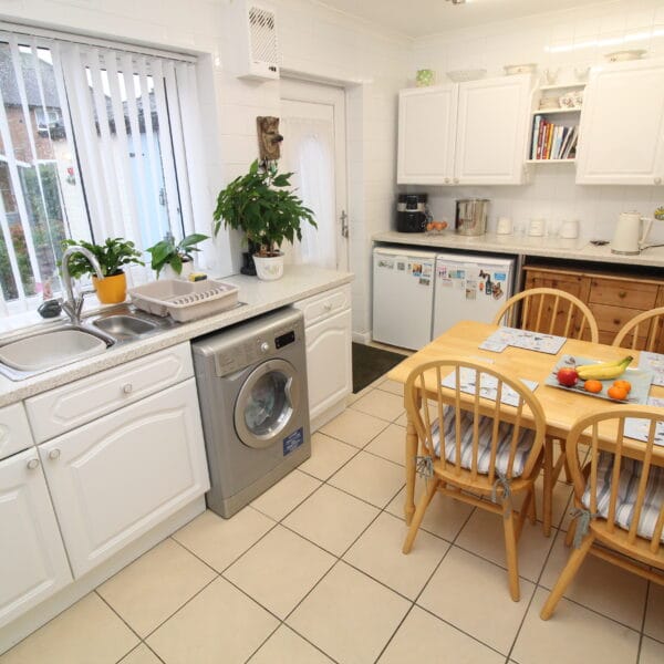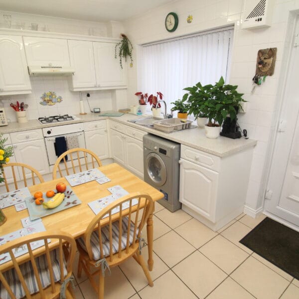 The dining kitchen is immaculate with a range of base and wall units with white gloss doors, contrasting work surfaces and splashback tiling. Integrated oven & hob. The dining area offers good proportions and is currently arranged with dining table & chairs. UPVC door out onto rear garden.