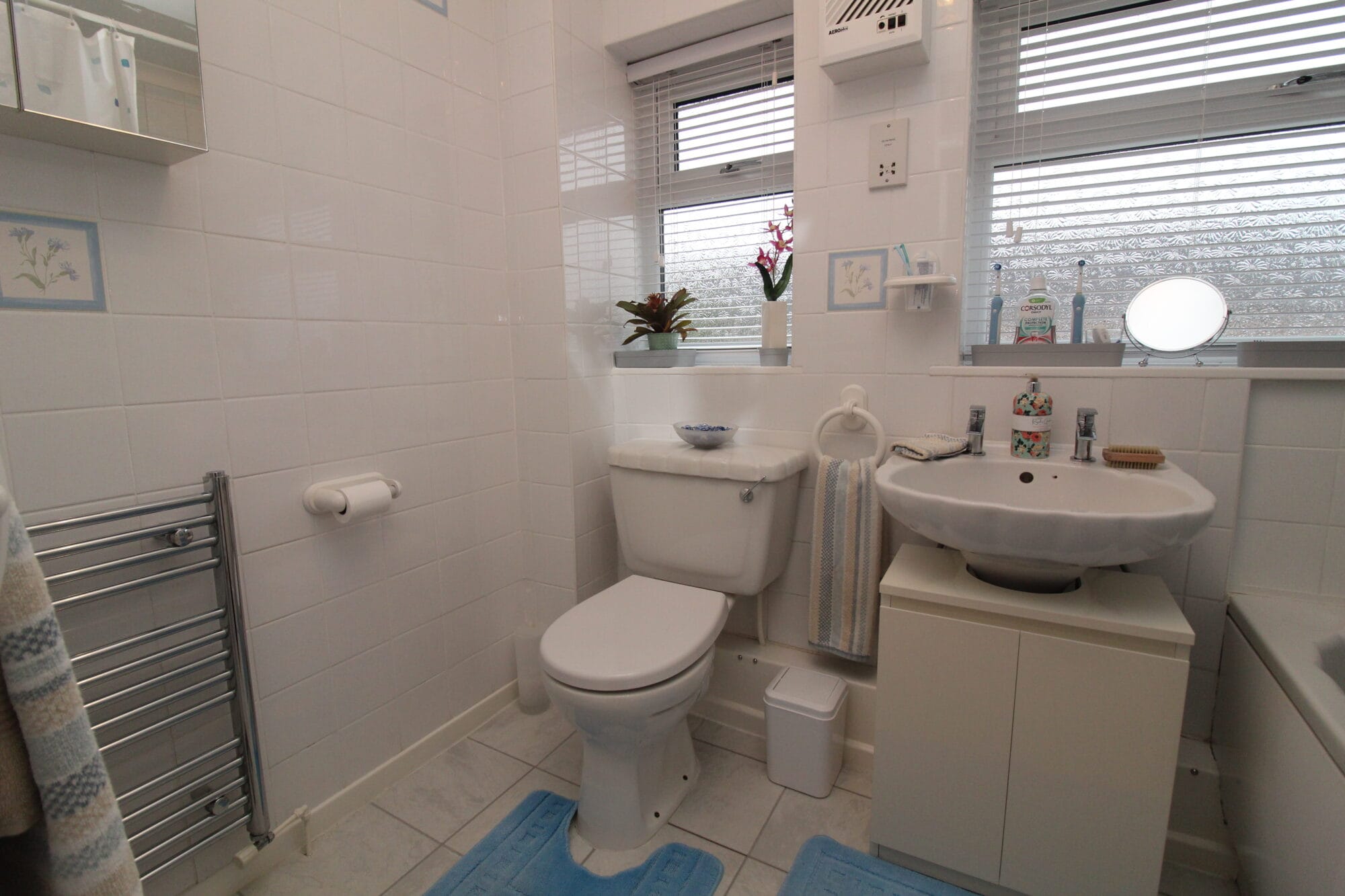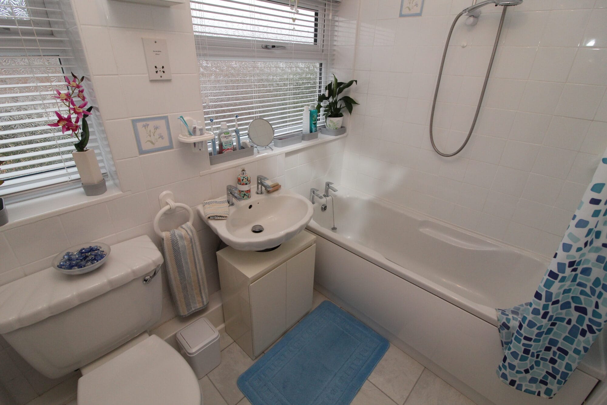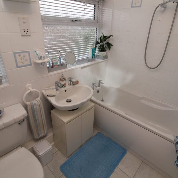 House bathroom is very well presented with a modern finish to include 3 piece suite in white to include bath with shower over, sink with pedastel & low flush with modern splash-black tiling.