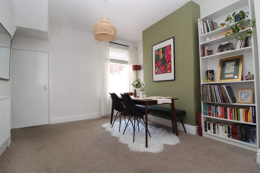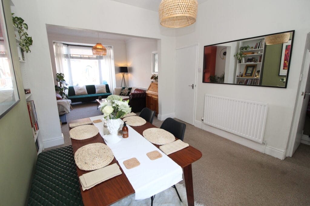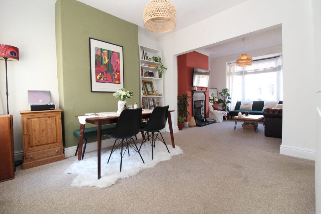 Off the hallway is a superb through lounge and dining room which offers a versatile space that can be combined or separated to suit. The front reception comes with original fireplace, is currently arranged with sofas and coffee table and features a beautiful bay window with made to measure blinds.