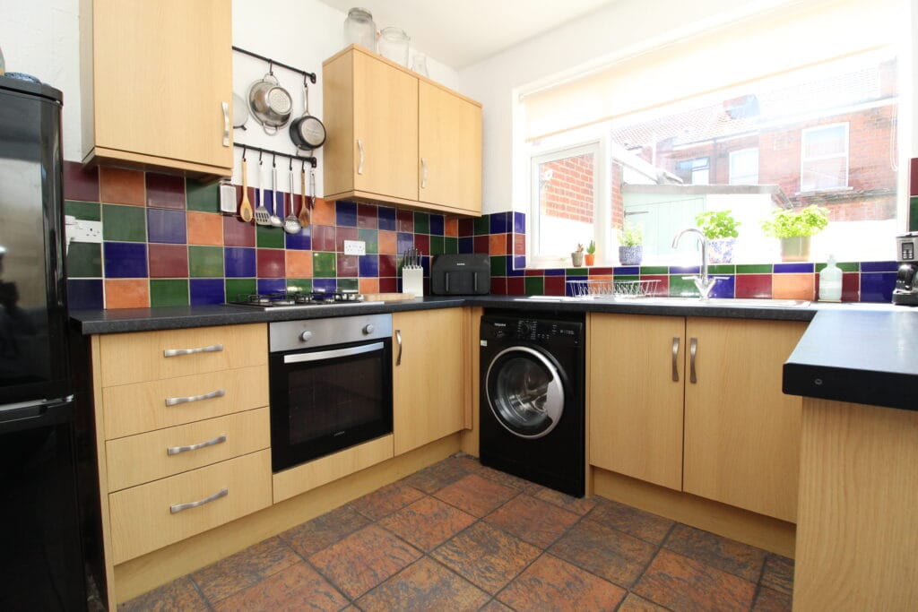To the very rear of the groundfloor is a spacious kitchen which presents a modern and practical space with lots of storage to include a range of base & wall units with contrasting work surfaces with sink inset. There is an integrated oven and hob, plumbing for washer, tiled splashback and floors and door giving access on rear elevation.