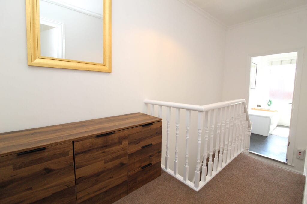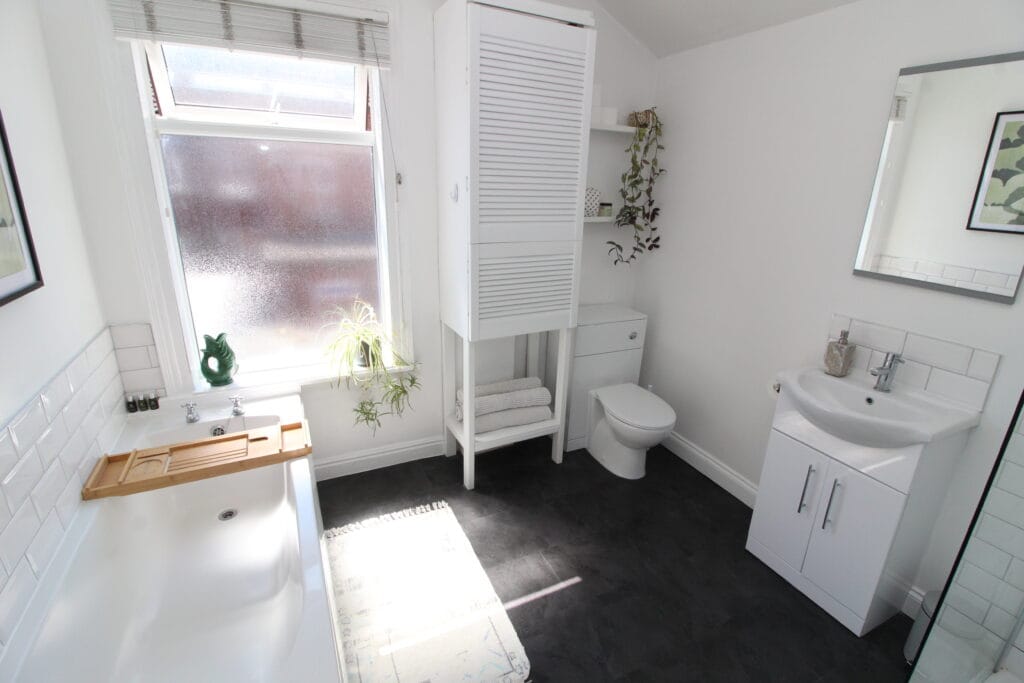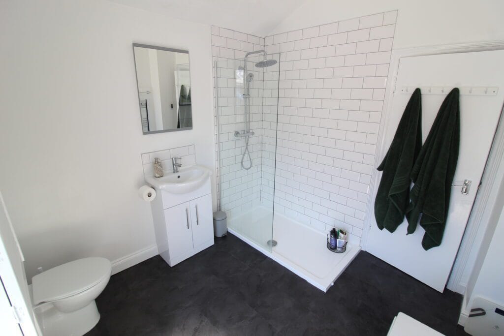 The first floor bathroom offers excellent proportions and is arranged with bath, low flush toilet with enclosed cistern, vanity unit with storage and sink inset & separate double walk-in shower with modern splashback tiling and fixed glazed screen.