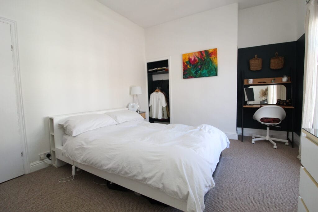 Double bedroom with neutral décor and floor coverings, lots of natural light and space for double beds and wardrobes/dressing tables. Enjoys views over the rear terrace and comes with original fireplace.