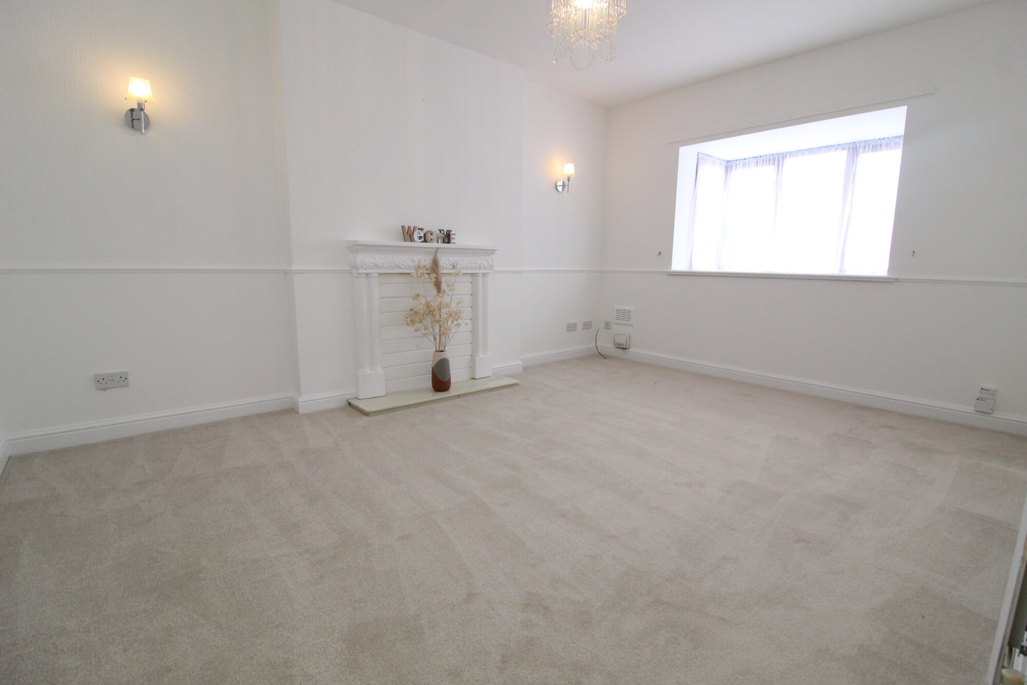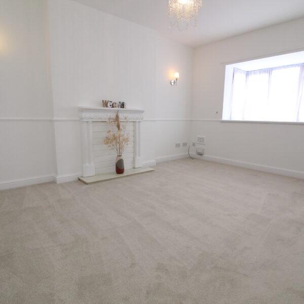A spacious living room with a feature fireplace, large front-facing bay window, and fresh neutral décor, providing a warm and welcoming living space.