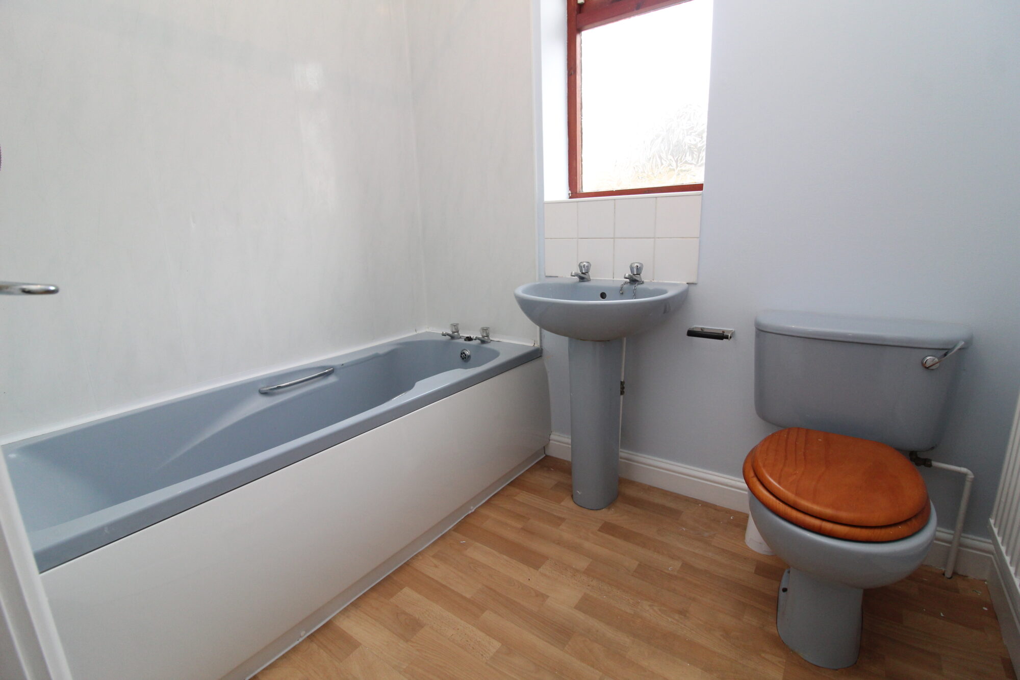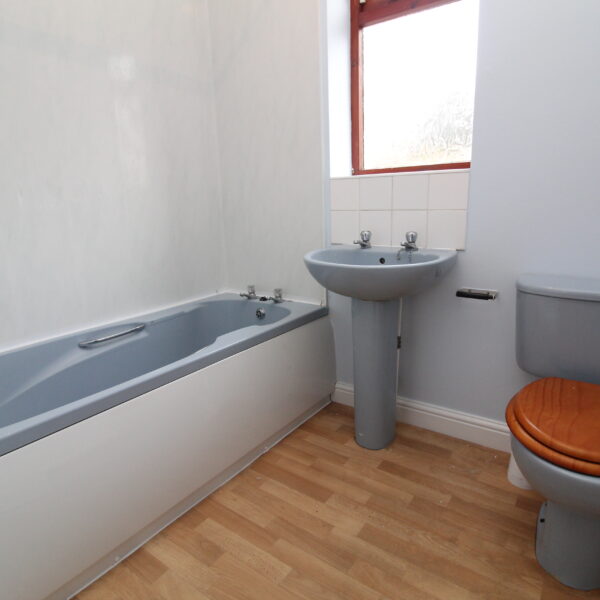 Modern three-piece bathroom suite including panelled bath, pedestal wash basin, and WC. Neutrally decorated with vinyl flooring.