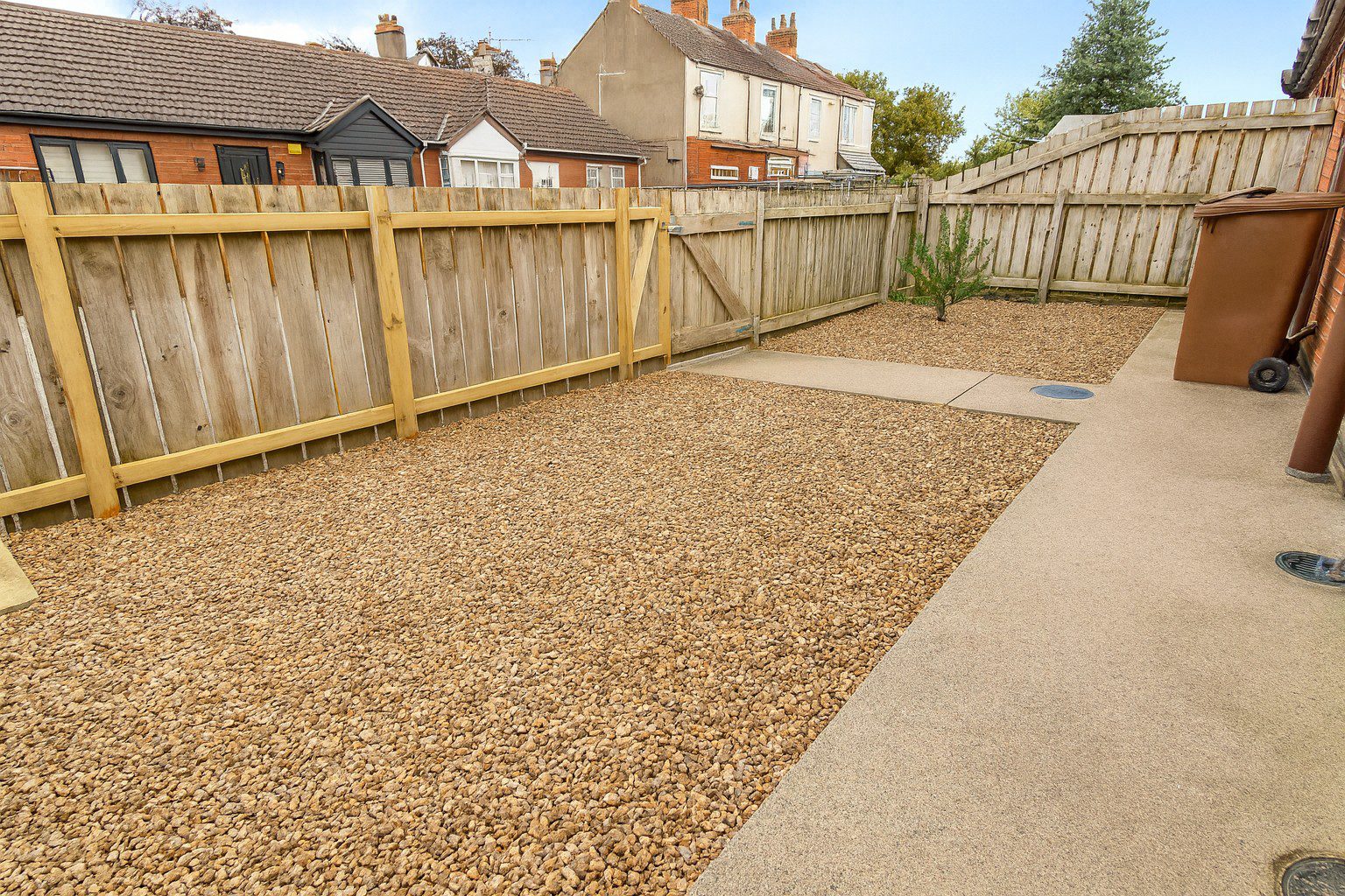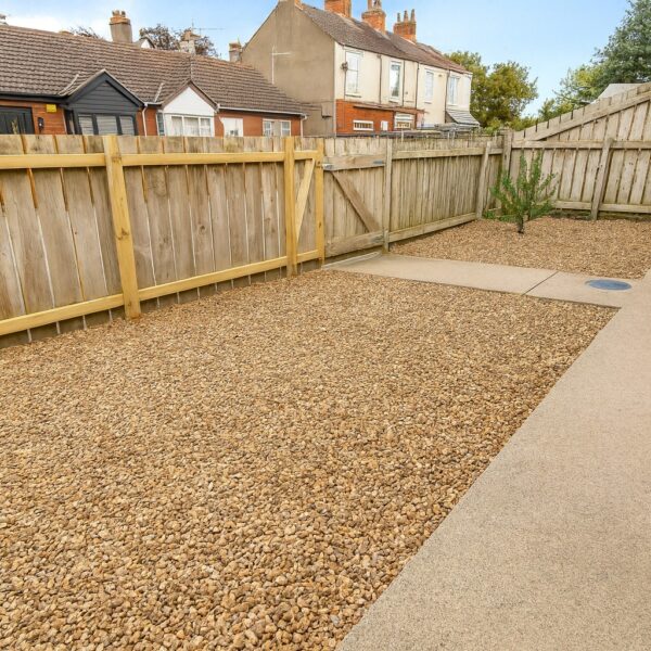 The property benefits from a private rear garden with paved areas and low-maintenance gravel beds. There is also a secure front garden with fencing, offering additional outdoor space.