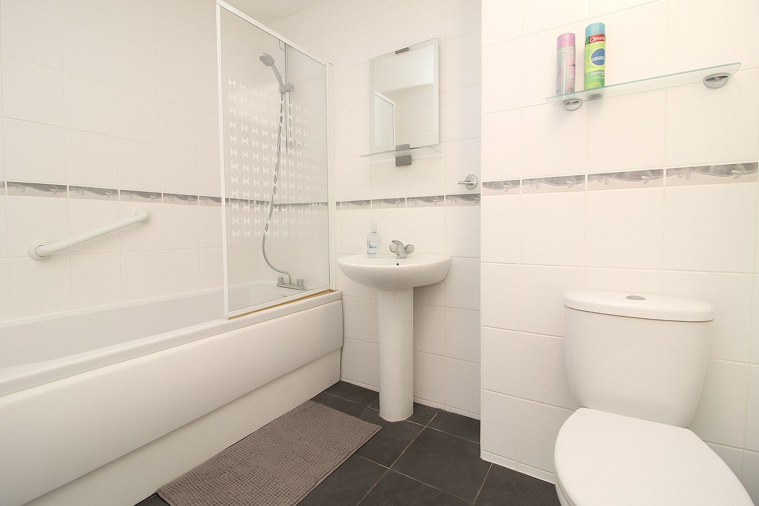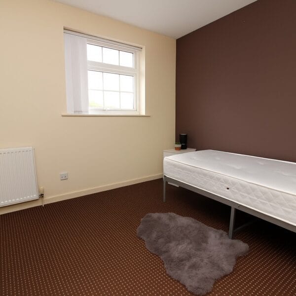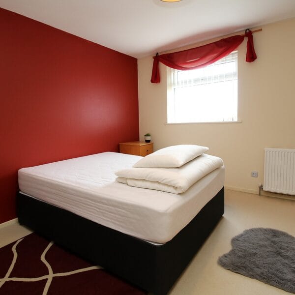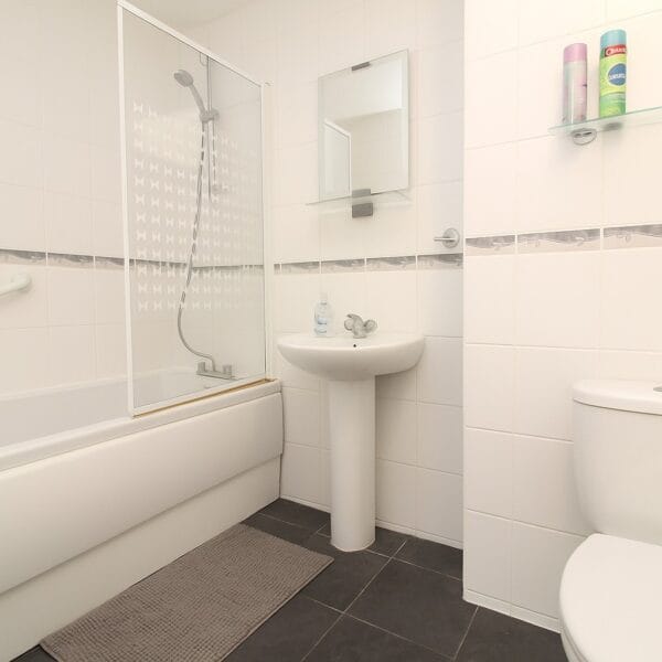 Upstairs, the property offers two generous bedrooms - the master featuring a bold accent wall and ample room for furniture, while the second bedroom provides an ideal guest room, nursery, or home office. The family bathroom is finished in white with complementary tiling, complete with a shower over bath, wash basin, and WC.