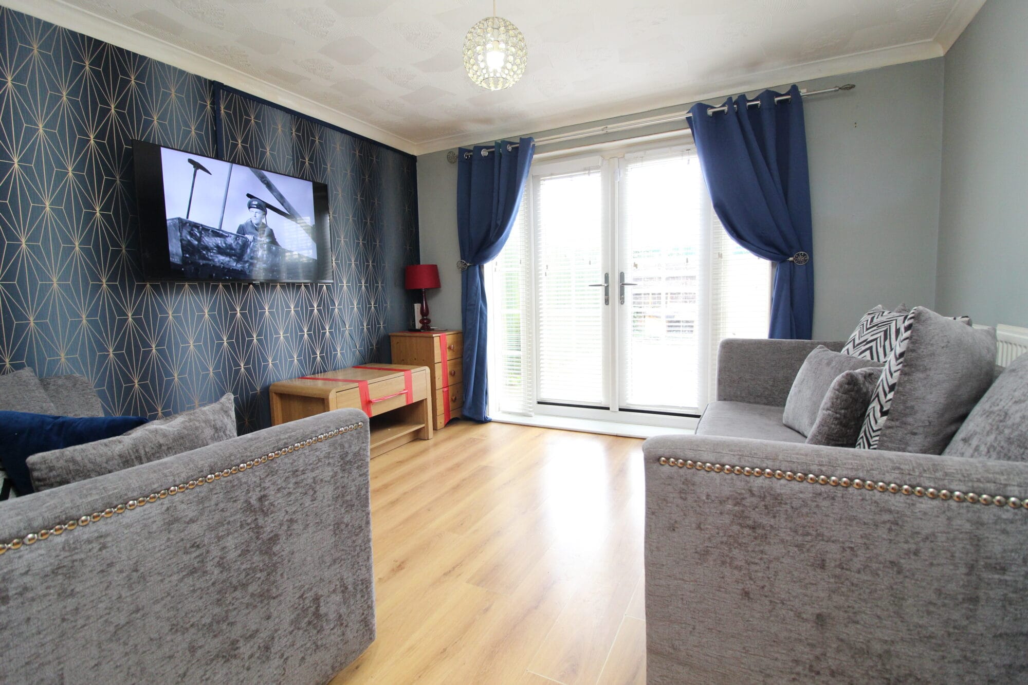 To the rear, a bright and comfortable lounge enjoys views of the garden through French doors, allowing natural light to flood the space and creating the perfect setting for relaxing or entertaining guests.