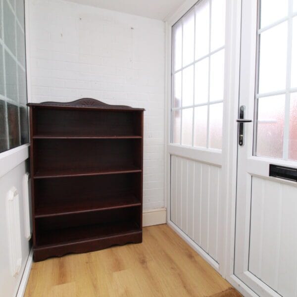 Step through the entrance porch into a welcoming hallway leading into a modern fitted dining kitchen, featuring an array of wall and base units, integrated oven, and plenty of countertop space for cooking and space for dining.