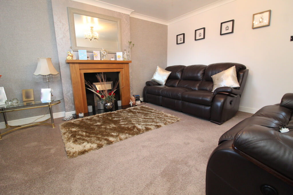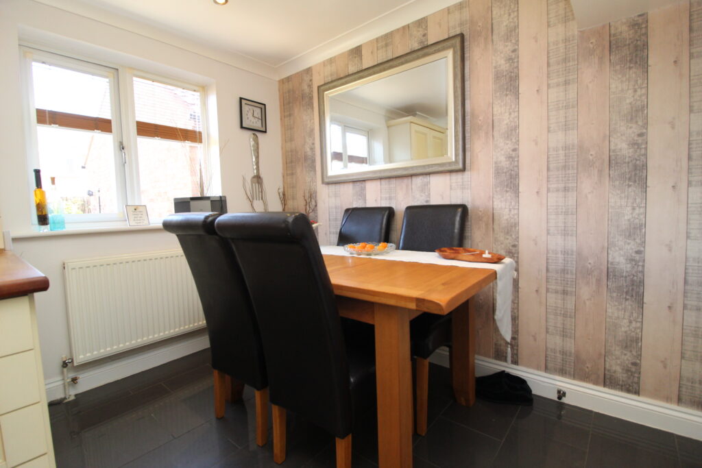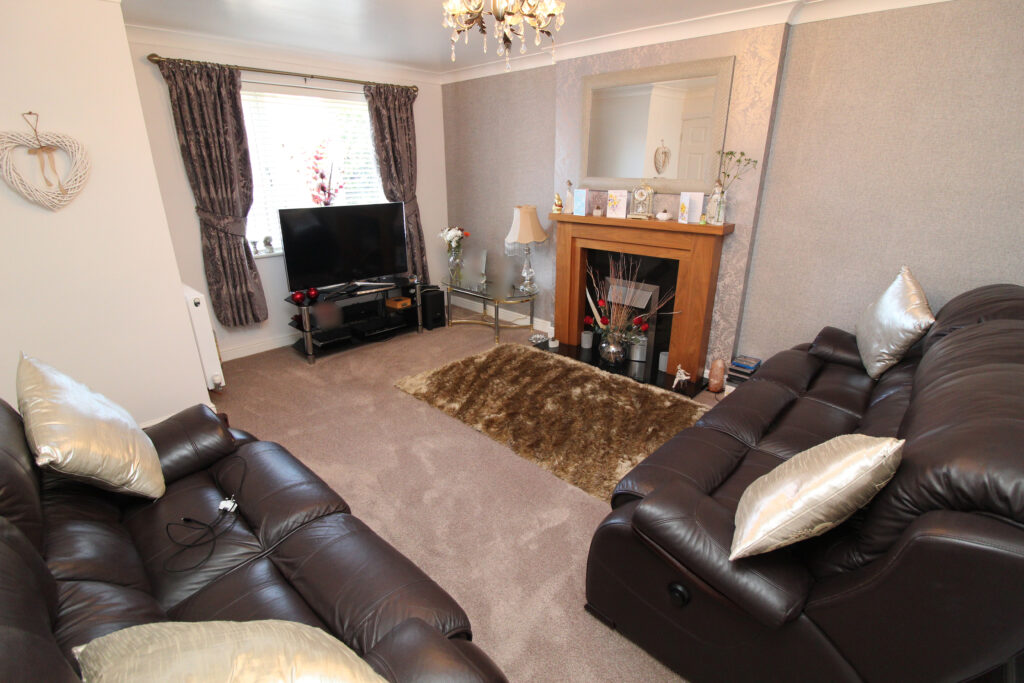 A welcoming entrance hall sets the tone for this immaculately maintained home, offering immediate access to a modern downstairs cloakroom. To the front, the lounge is a tranquil and beautifully styled space, complete with a feature fireplace, soft neutral palette, and a charming bay window that allows natural light to flood in.