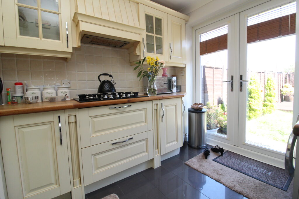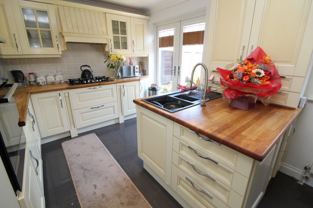 At the rear, the kitchen diner is the heart of the home-thoughtfully designed and fully fitted with shaker-style cabinetry, wood-effect worktops, and integrated appliances including a fridge and freezer. A central island with inset sink doubles as a breakfast bar and focal point for entertaining. French doors frame delightful views of the garden, offering a serene backdrop and seamless indoor-outdoor flow.