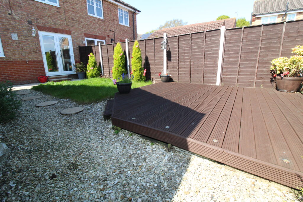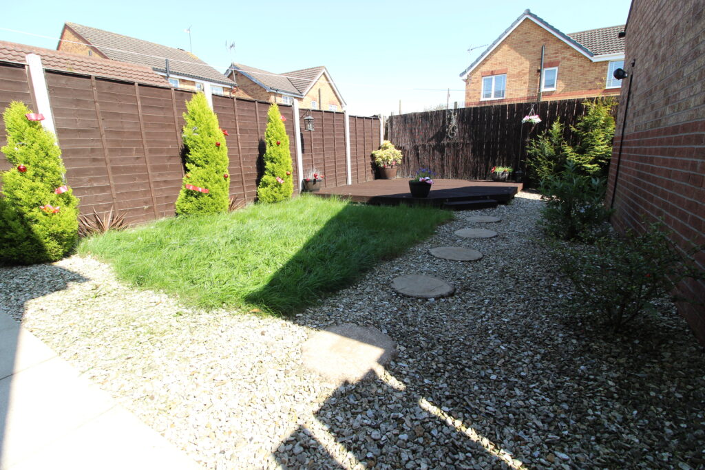 * Landscaped rear garden with lawn, gravel pathway and a raised decking area