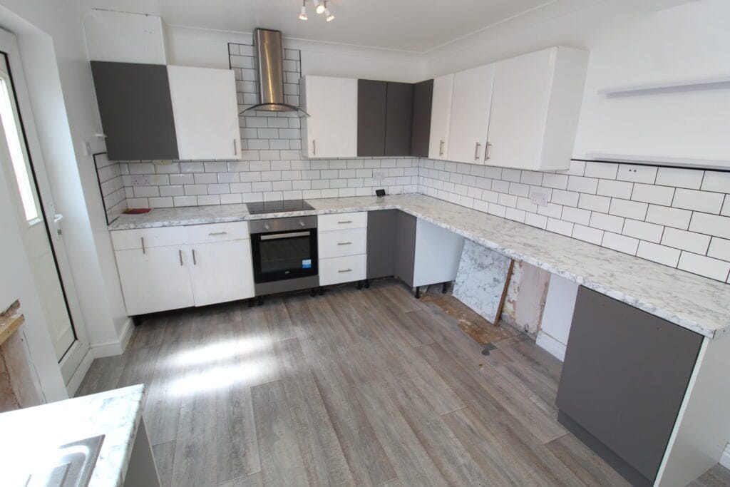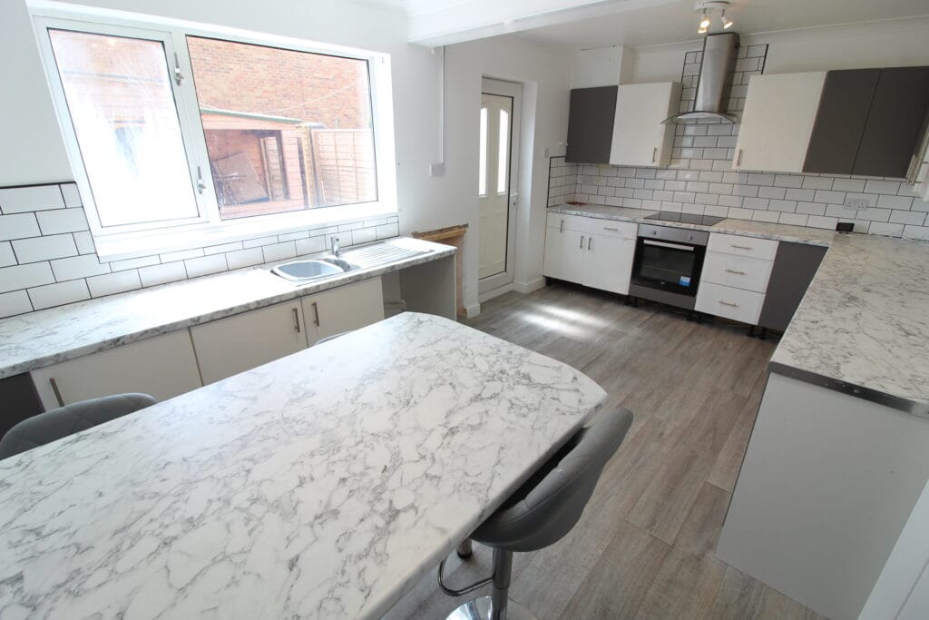 The open plan kitchen/dining space comes with a range of base & wall units & has lots of potential to modernise. Comes with fixed island and lots of work surface.