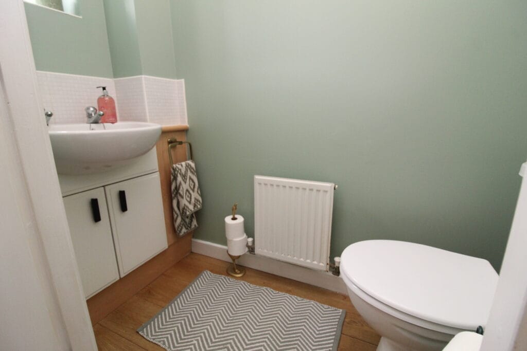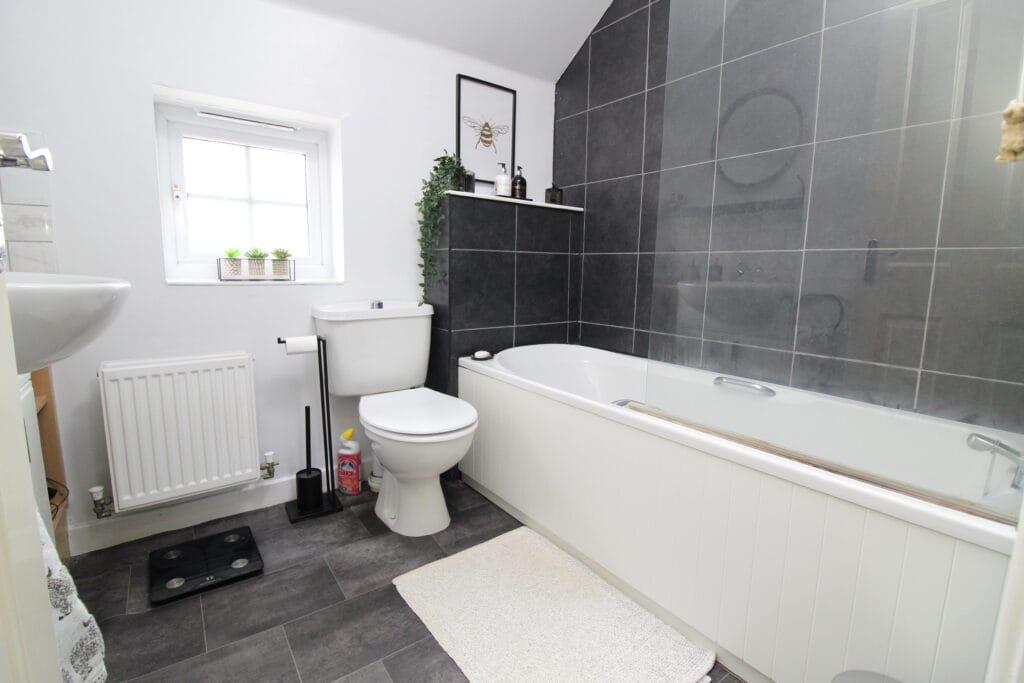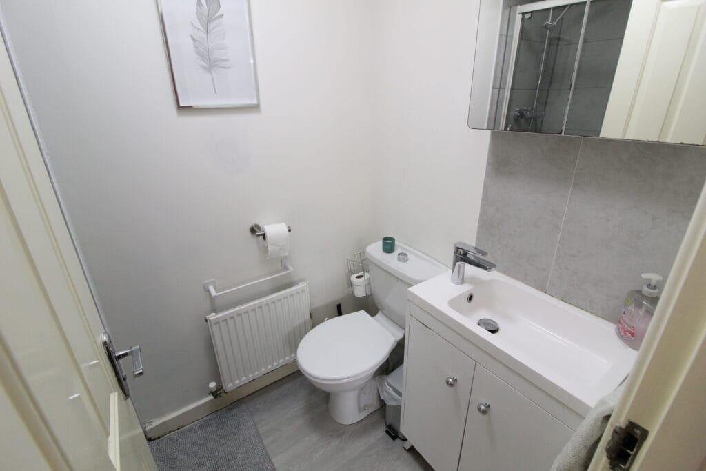 The family bathroom has a high-spec contemporary finish and comes with shower over bath, modern sink and toilet. Finished to a high standard with storage.
