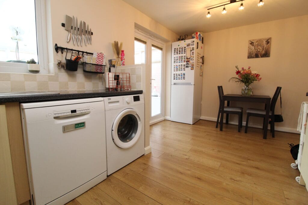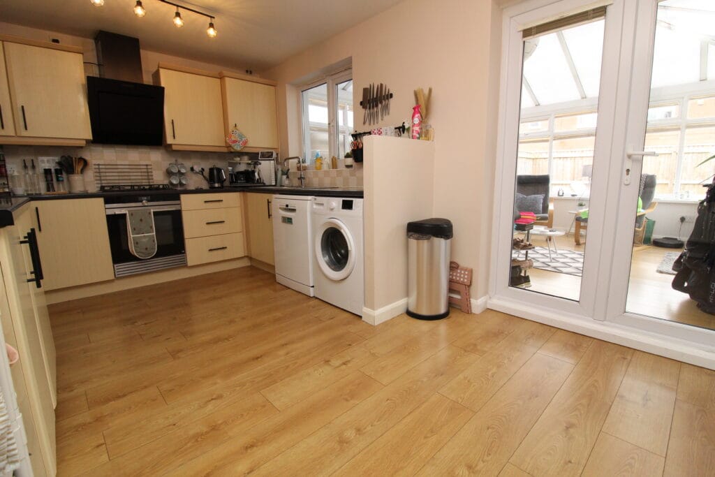 Off the lounge is a wonderful spacious modern dining kitchen with a range of base and wall units, with modern contrasting work surfaces. Kitchen boasts stainless oven & hob and extractor. There is room for a dining table and extra storage space. French doors leading to the conservatory