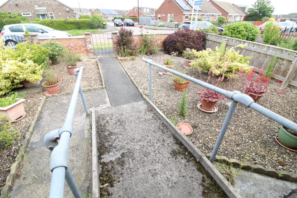 Outside, the house sits on a good-sized plot. To the front elevation offers low maintenance landscaped area with adapted concrete ramp with safety railings allowing access to front door. To the rear elevation is a good-sized private garden, mainly paved and currently arranged with 6 ft perimeter timber fencing, gate to rear. There is a garage with additional lean-to. Steel up & over door.
