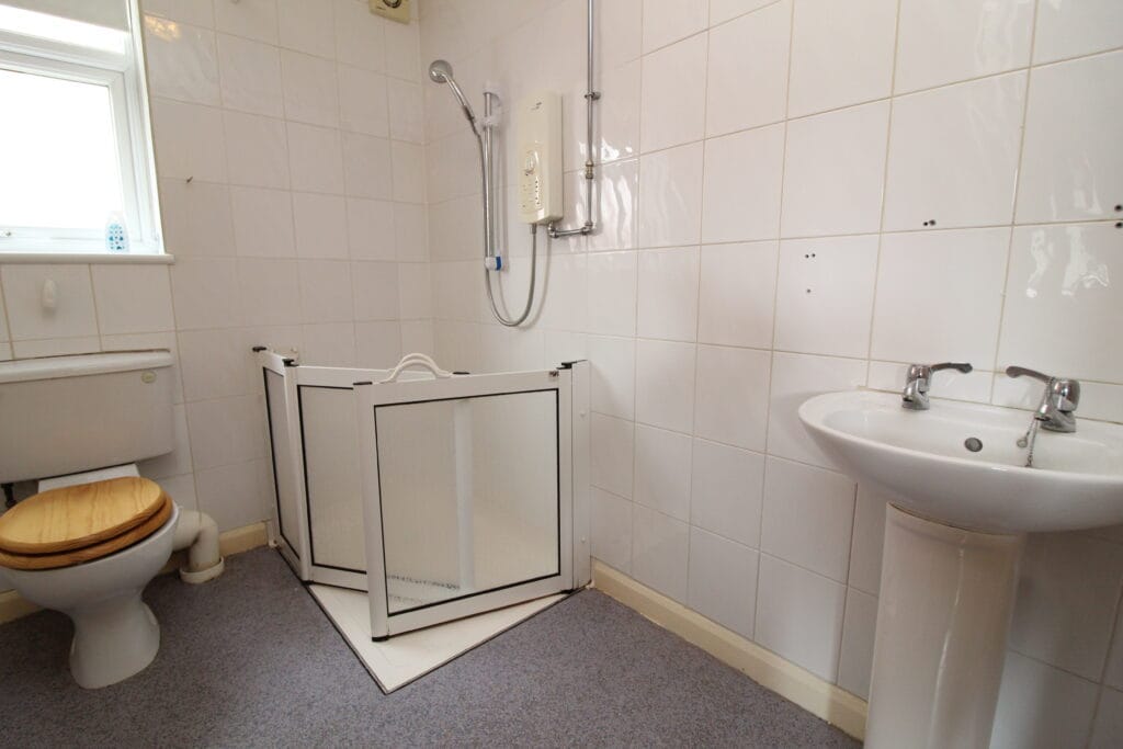 Shower/wet room is has been adapted to offer walk-in shower with low screen, low flush toilet and sink with pedastel.