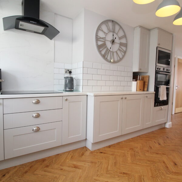 * Contemporary light grey shaker-style cabinetry - sleek, stylish & ample storage