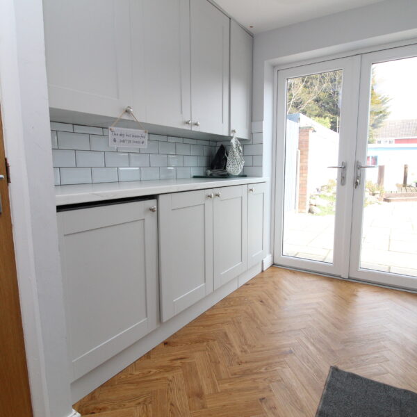 A beautifully designed and highly functional utility room featuring stylish grey cabinetry with ample storage, a sleek worktop, and modern subway tile splashback. The space is well-lit with natural light streaming through the large French doors leading to the garden, creating a bright and airy atmosphere. Space for a washing machine and dryer complete this practical yet elegant space.